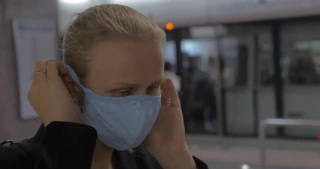 674522 - In Hong Kong, China in subway a young girl wears a medical mask
