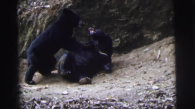 > 1962: couple bears play around in the woods with each other in front of a cave CALCUTTA