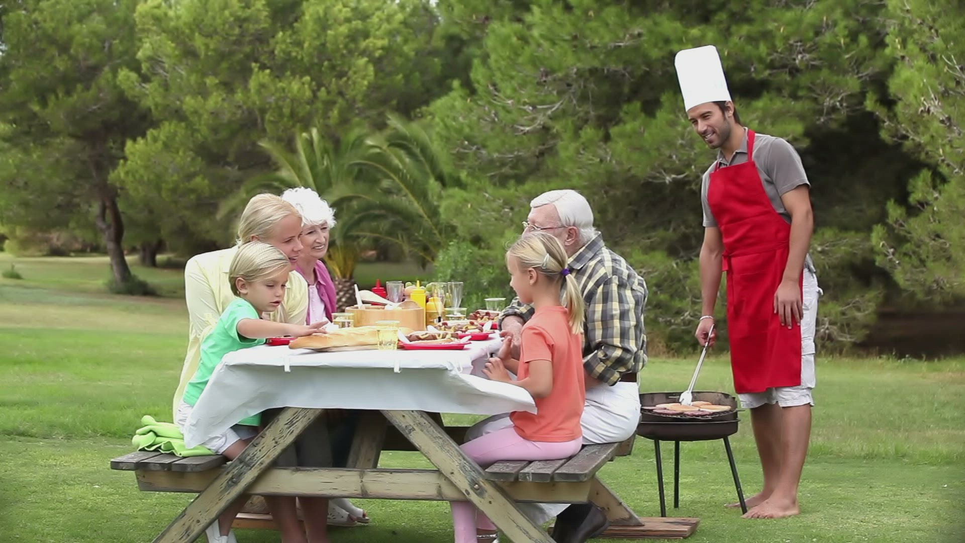 > 1964: a large group of people sit at folding tables at a barbecue in a park CAMDEN, NEW JERSEY