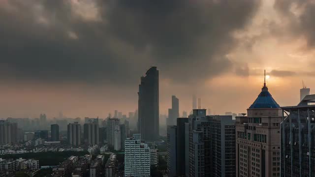 Aerial shot above high-rise buildings and construction site in Shanghai, China