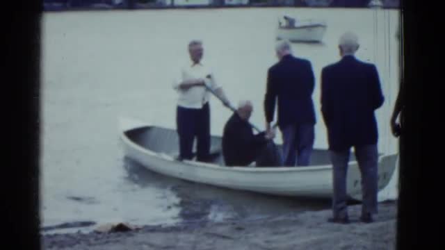 1951: old men climbing into boat rowing on lake waters. DANVILLE, ILLINOIS