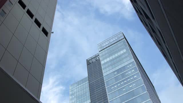 Clouds moving in the blue sky over skyscraper in Tokyo, Japan