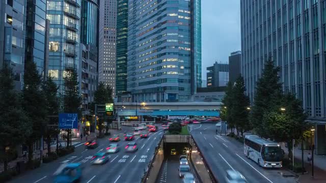 > Pan-up time-lapse footage of traffic in the evening in Tokyo, Japan