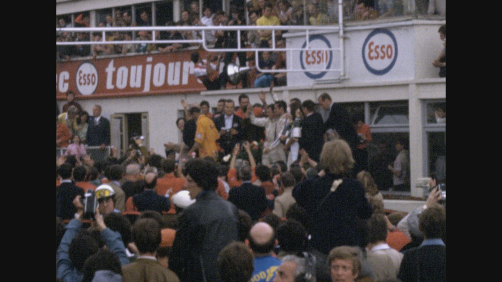> 1963: a crowd is seen posing beside a car. CALIFORNIA