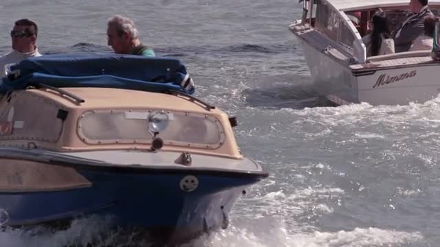 1955: old guy wearing yellow trunks happily swims through the waves of the ocean MIAMI, FLORIDA
