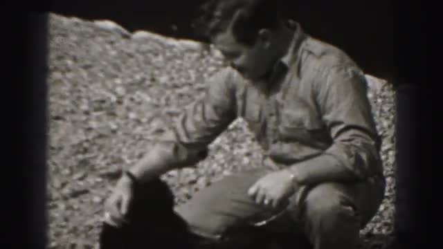> 1946: stocky caucasian jolly man plays with small black dog HARRISBURG