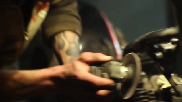 600474 - Automaster weld the frame of a custom motorcycle in the garage.