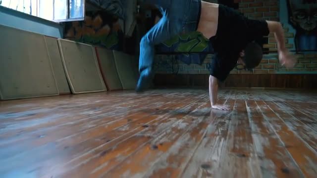 641976 - Young man dancing breakdance in training class