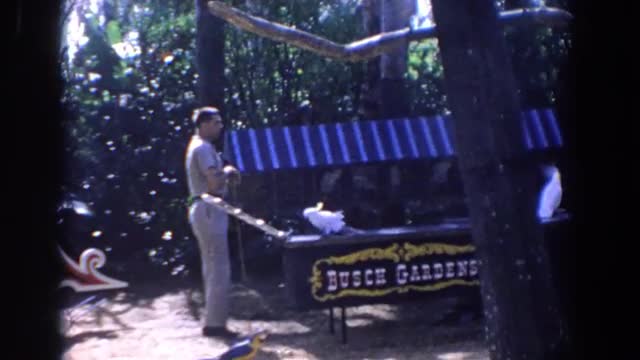> 1951: colorful parrots and macaws atop a cage in the trees FLORIDA