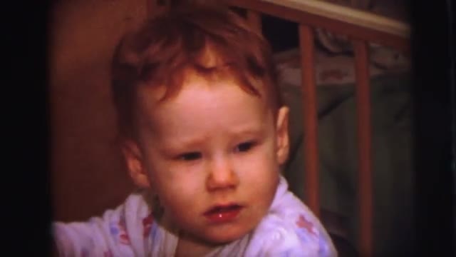 > 1973: cute redhead baby boy in crib reaching around grabbing at things. LYNBROOK, NEW YORK