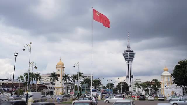 Alor Setar, Malaysia, Kedah. Lighthouse Rumah Api Dataran Tanjung Chali on River Sungai Kedah Chinatown Area. Day Light With Clouds. on the Background Menara tv Tower and Malaysia States Flags. November 4, 2015