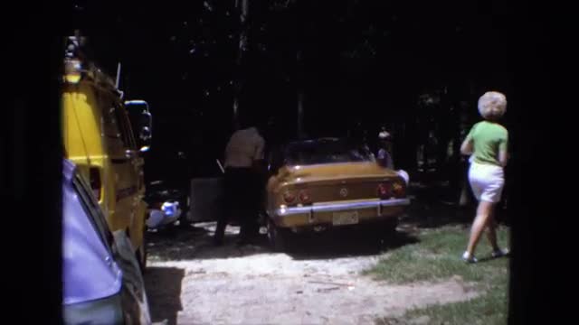 > 1976: picnic party getting out of the car in a beautiful destination FORT WAYNE, INDIANA