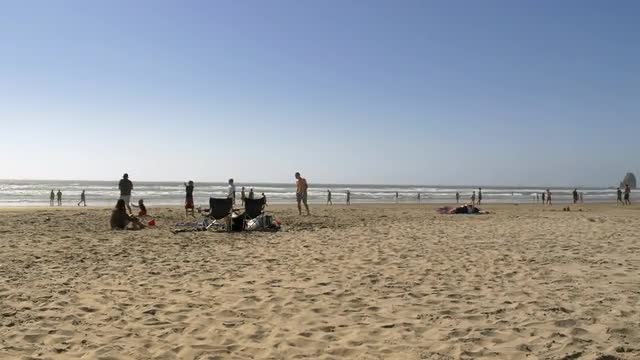 > 1976: perfect beach scene people having hot summer fun on the sandy area FORT WAYNE, INDIANA