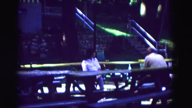 > 1971: people sitting casually at picnic tables in a park OMAHA, NEBRASKA