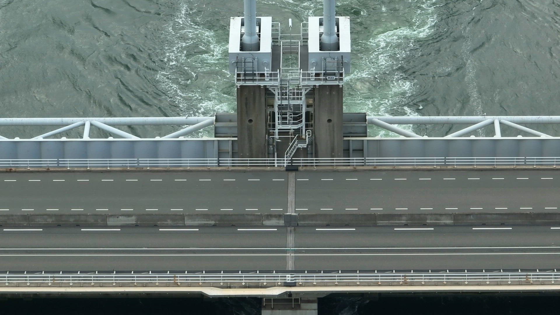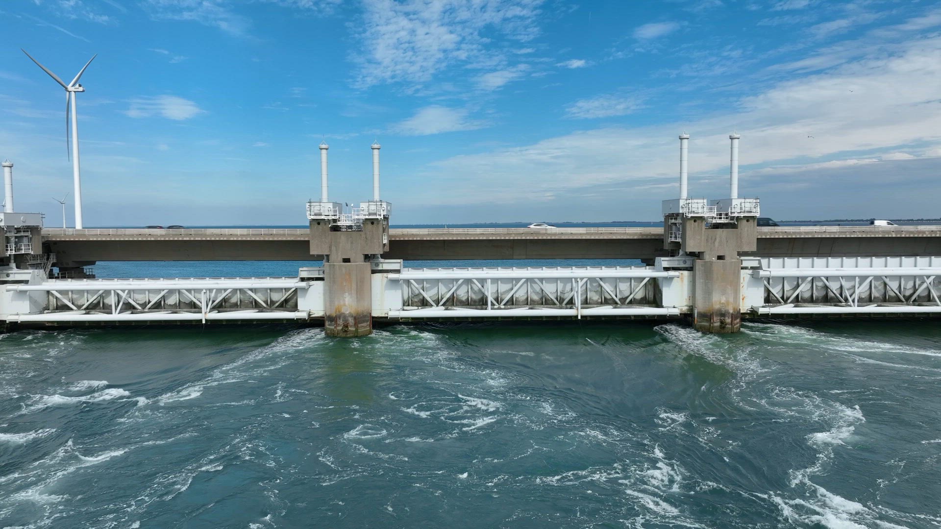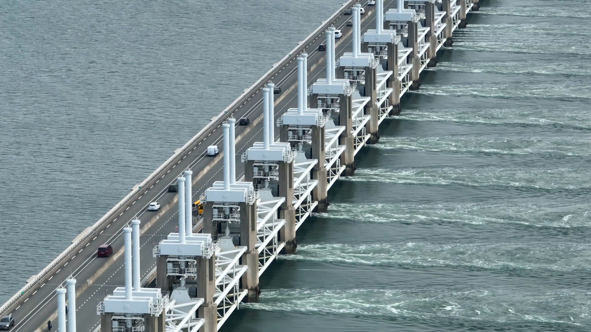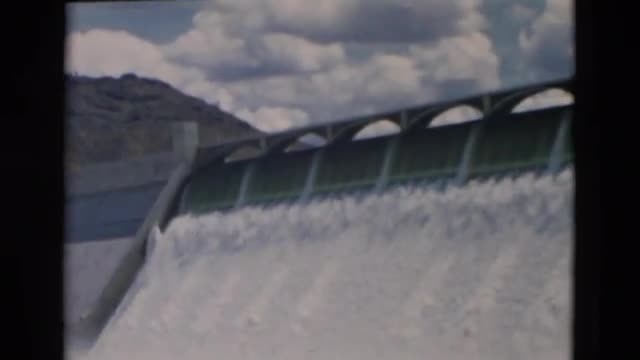 > 1958: water rushes through openings in dam barrier and down a slope creating mist OREGON