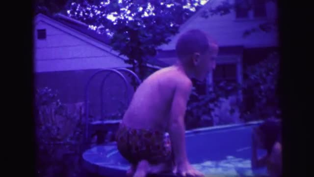 > 1972: brother and sister playing happily in backyard pool in the summer LYNBROOK, NEW YORK