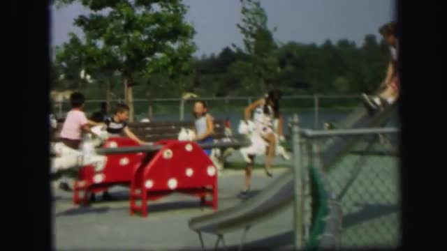 > 1972: many children are at a playground playing on equipment such as teeter totter and slide LYNBROO