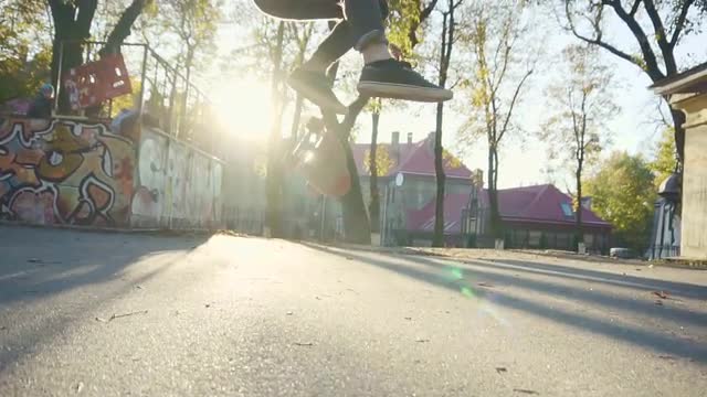 Autumn sunset shot of a young man failed flip trick on a skateboard in the skatepark in sunny day, 100FPS record, slowmotion