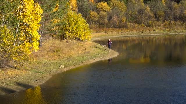 Young Girl Jogging Around the Lake on a Background of Water