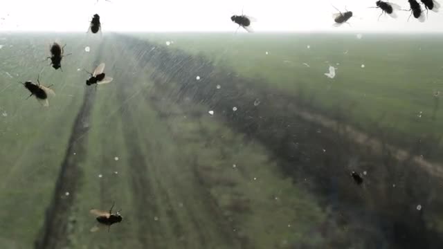 Lots of Flies Creep on Glass Windows Overlooking Field Outgoing Into Distance