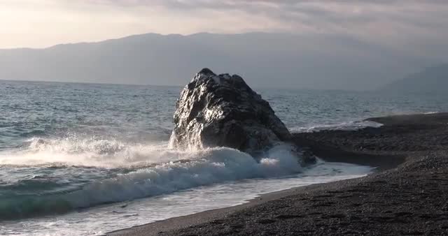 > View of Waves Rolled at Sea Coast Line With Huge Rock at Sunset