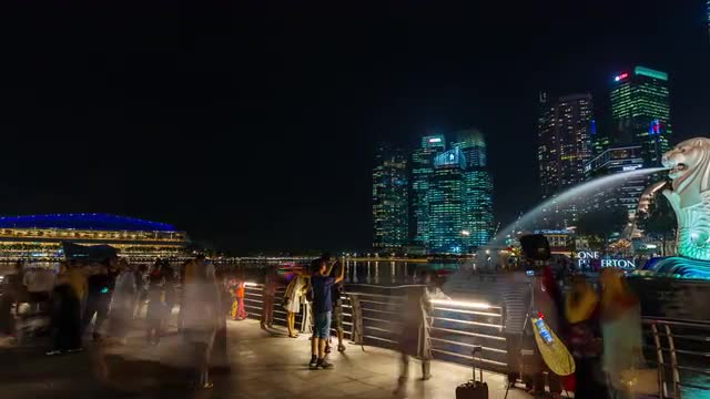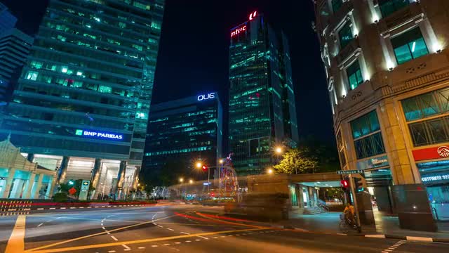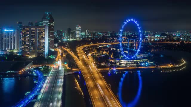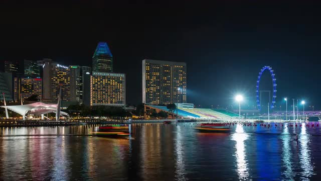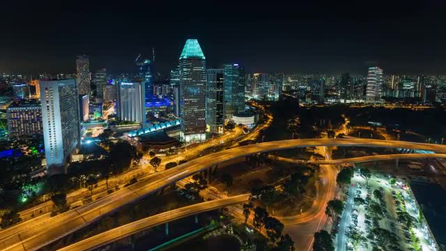 Time lapse of Singapore City Skyline at Marina Bay. Moving traffic.