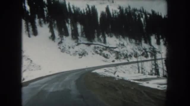 1962: a beautiful snow capped mountain ridge as seen from a moving vehicle COLORADO