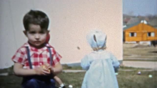 > 1964: children during easter egg hunt in backyard happily find eggs CAMDEN, NEW JERSEY