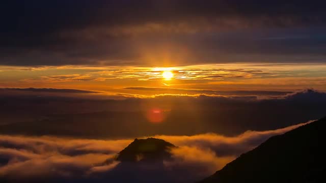 Fog clouds covering the low lands and sunsets between clouds