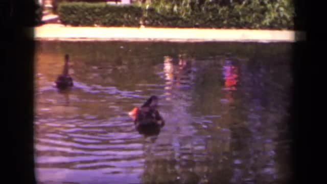 > 1961: ducks paddle in the water and eat food thrown by two girls standing by pond MICHIGAN