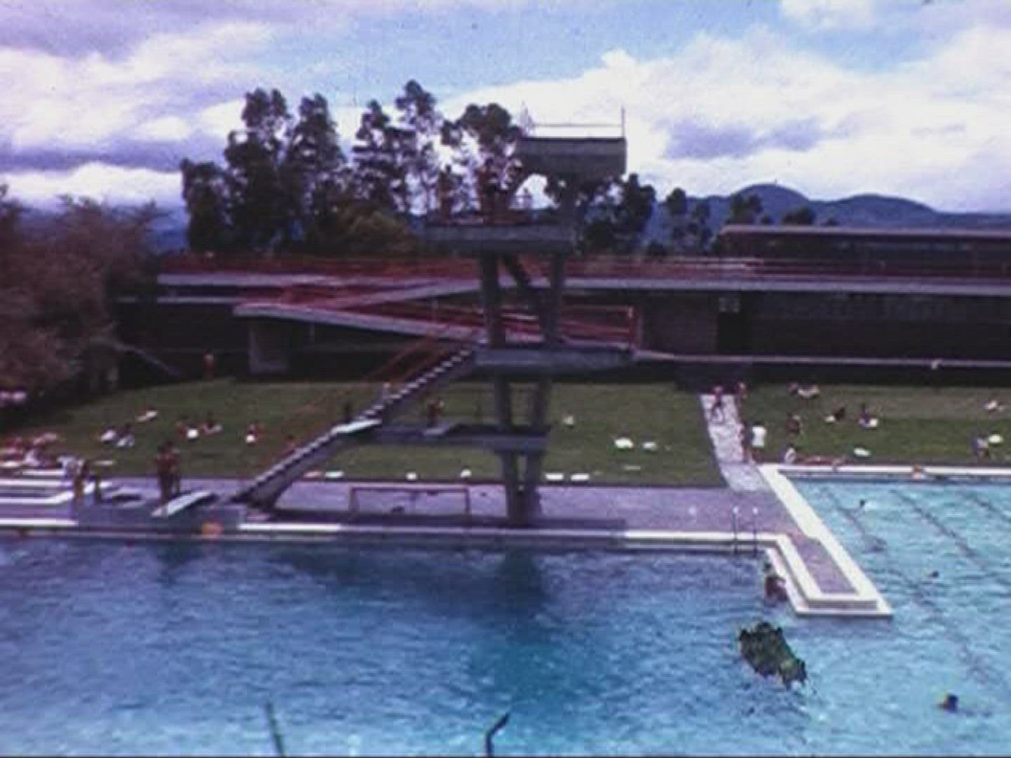 > 1962: people talking near outdoor swimming pool DALLAS