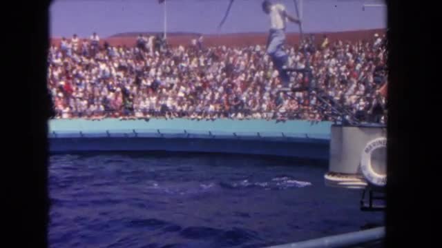 1962: man feeding dolphins and a whale at a seapark SAN PEDRO, CALIFORNIA