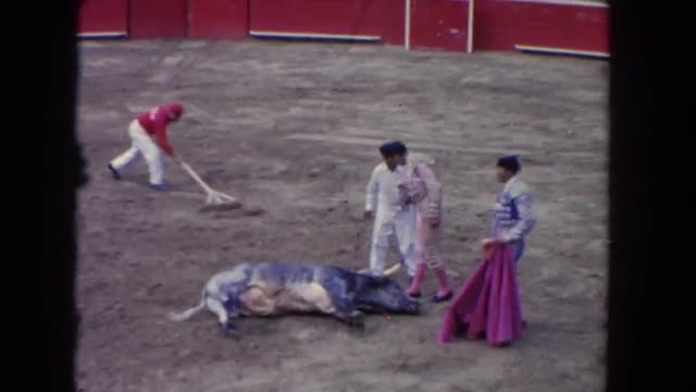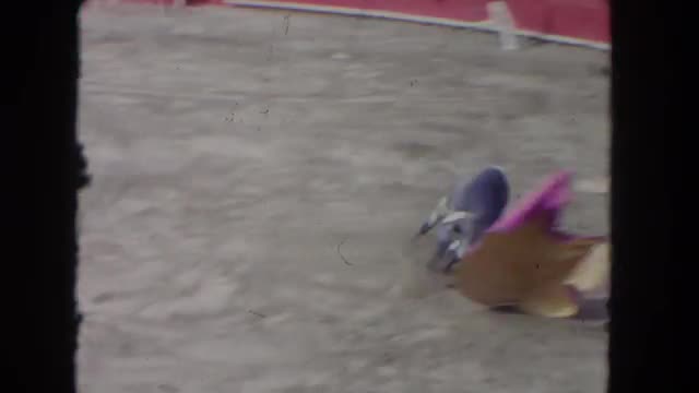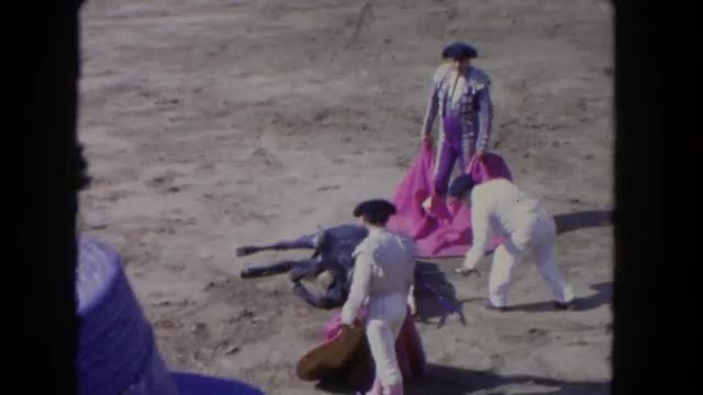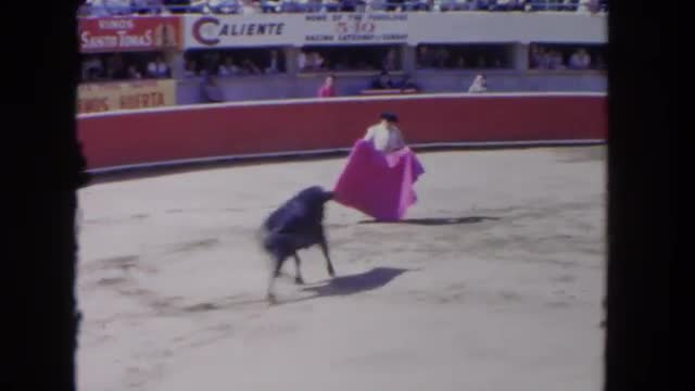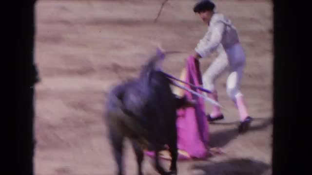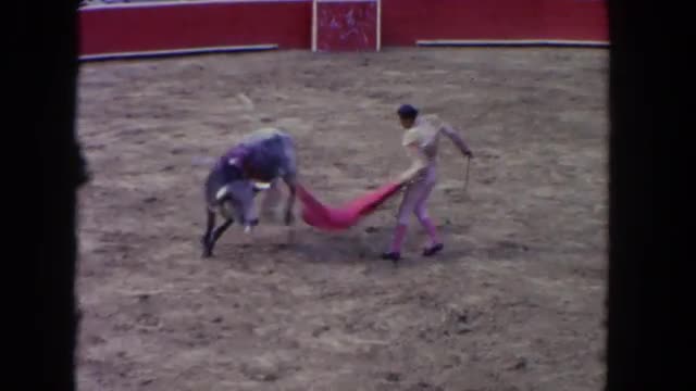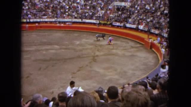 > 1962: man entertaining crowd by tricking a bull and making it angry SAN PEDRO, CALIFORNIA