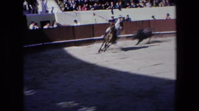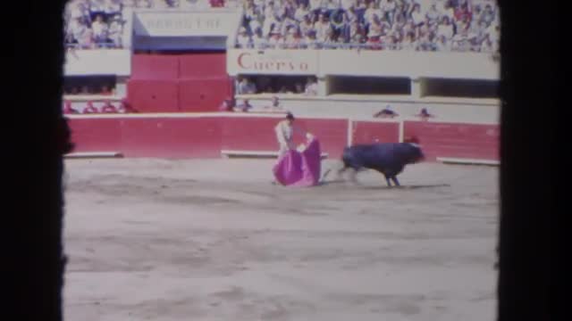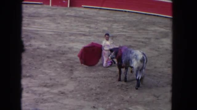 > 1962: a man is playing with the bull and the red rag SAN PEDRO, CALIFORNIA