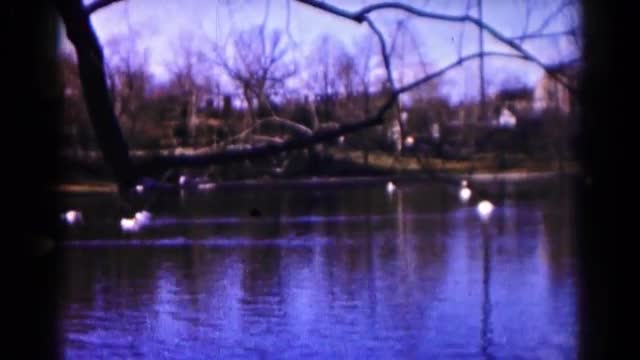 1959: white ducks float on the water in a pond surrounded by trees on a cloudy day. HAGERSTOWN, MARY