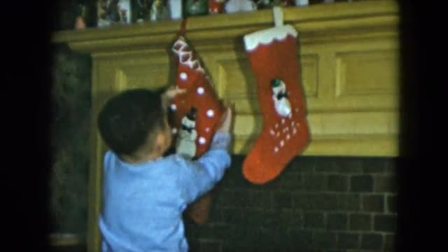 > 1962: children in pajamas hanging their christmas stockings on the edge of a table CATSKILL, NEW YOR