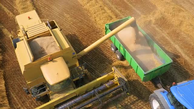 Closeup Aerial Drone footage of combine harvester unloading into trailer, UK