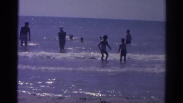 > 1962: adults and children wading in surf on a sunny day CATSKILL, NEW YORK