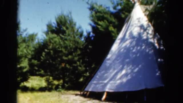 1962: various people and boys in yellow shirts gathered under a darkly lit teepee like tent CATSKILL