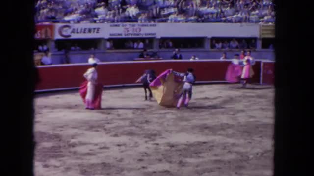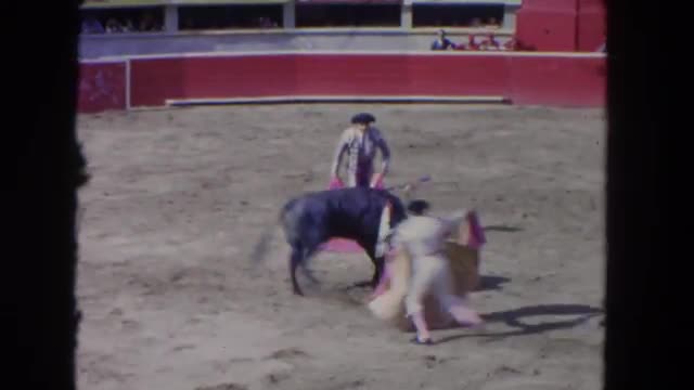 > 1962: a matador uses his cloak to bullfight a bull in a bullring full of people MEXICO