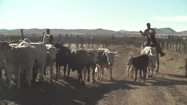 > 1959: cowboys herding cattle in desert with mountains in the distance ARIZONA