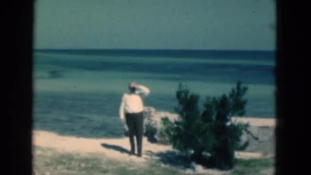> 1950: a man fully dressed walking along the ocean coastline FLORIDA