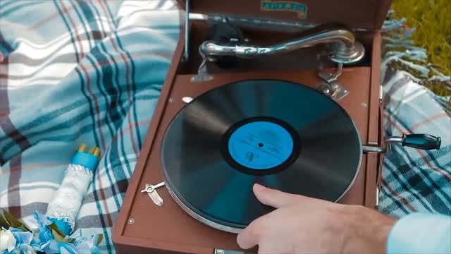 Vinyl Deck Playing, Blue Background. Men in Blue Open. he Opens the Lid and Puts the Gramophone Vinyl Record. Left of the Gramophone is a Bridal Bouquet With Blue Flowers.
