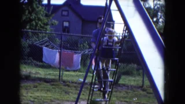 > 1954: father plays with daughter in the backyard on a slide HICKSVILLE, NEW YORK