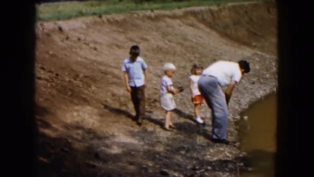 > 1955: dad digging at the edge of a pond while three small children watch HICKSVILLE, NEW YORK