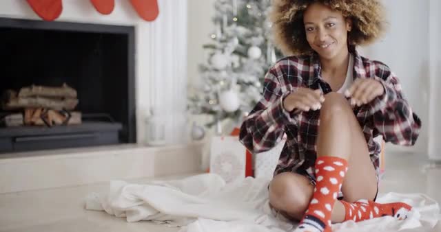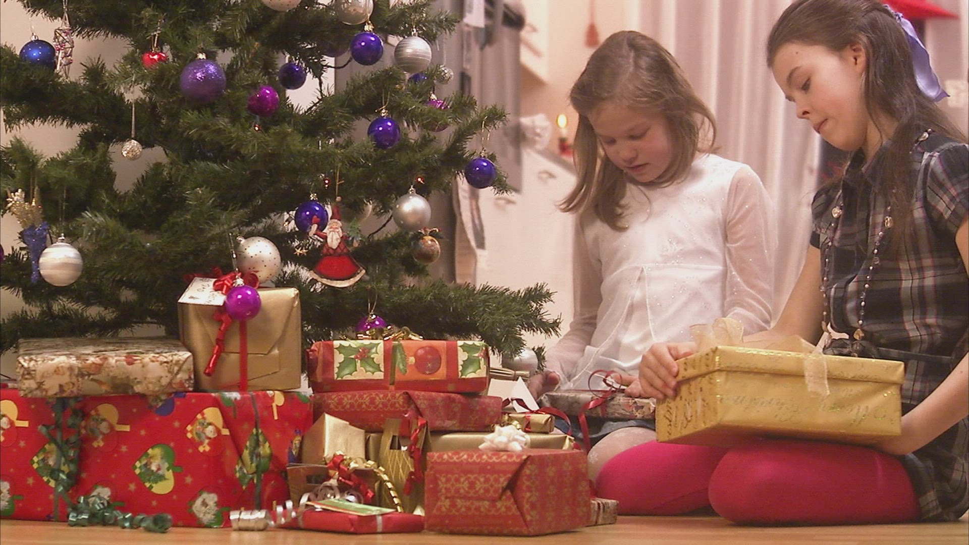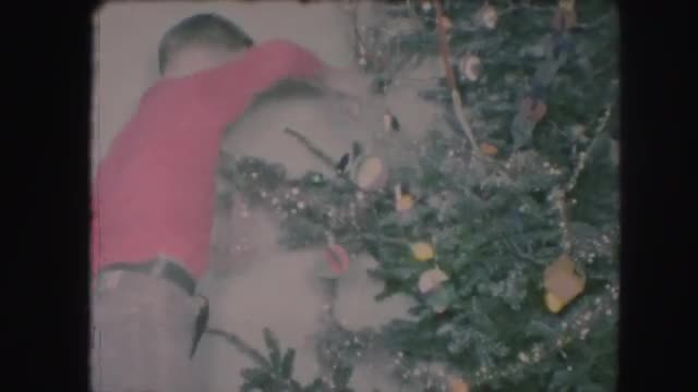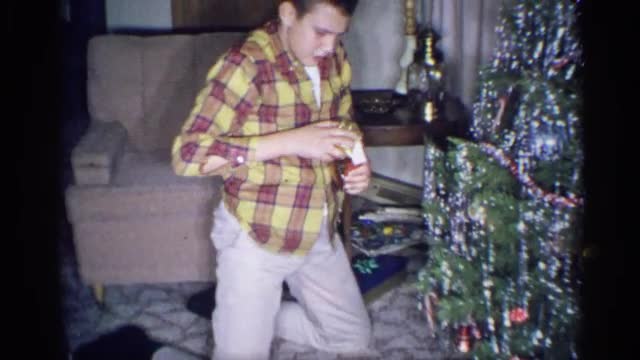 > 1967: older boy sitting next to christmas tree opening a gift HAGERSTOWN, MARYLAND