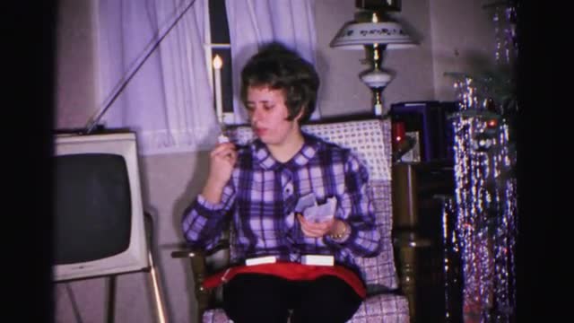 1967: a woman sitting beside a christmas tree is inspecting a present she opened HAGERSTOWN, MARYLAN