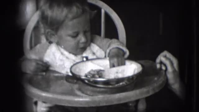 > 1942: toddler in a highchair eats lunch from a bowl with her hands. NEW YORK