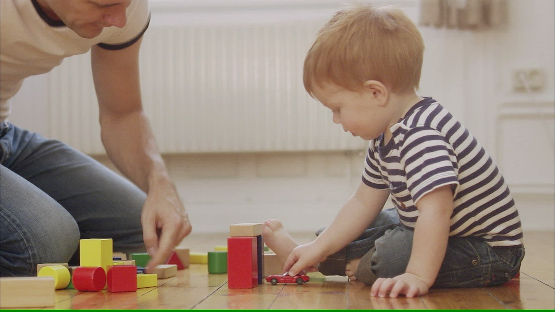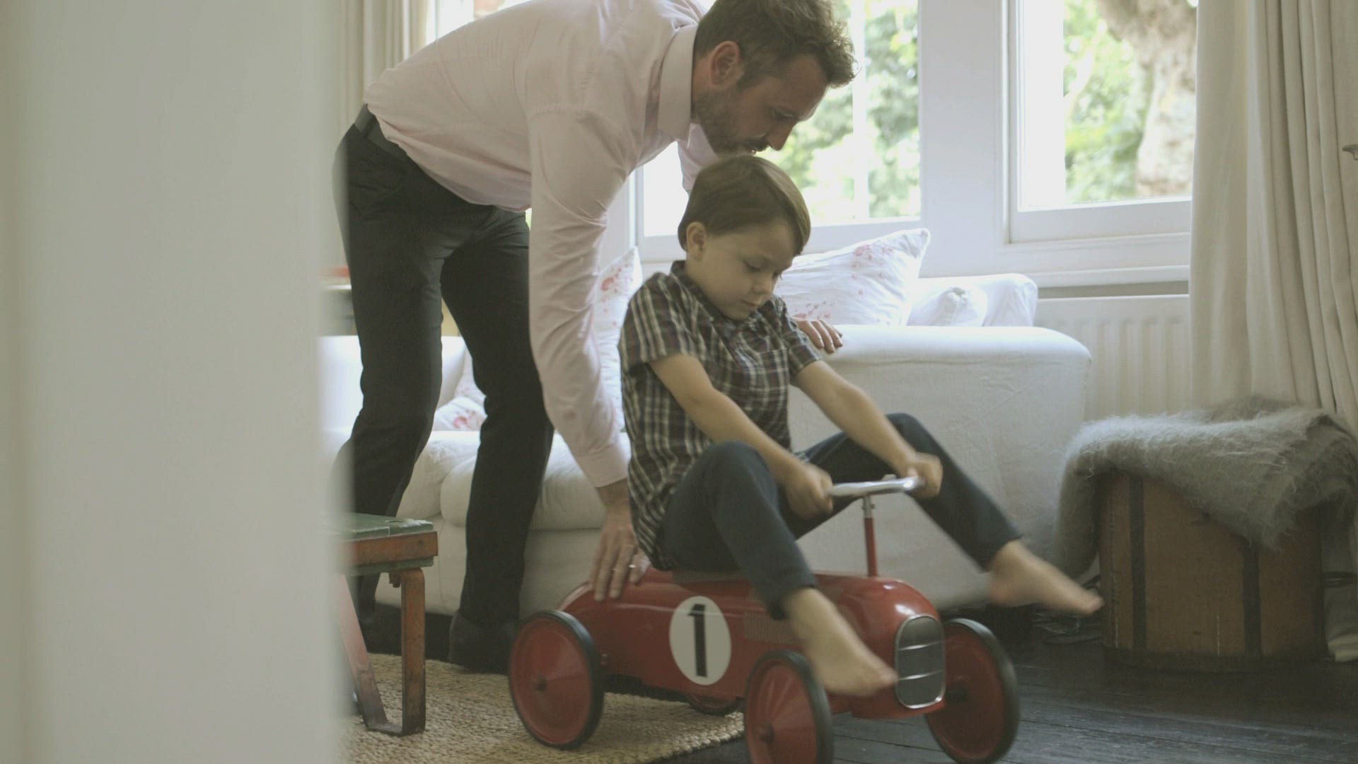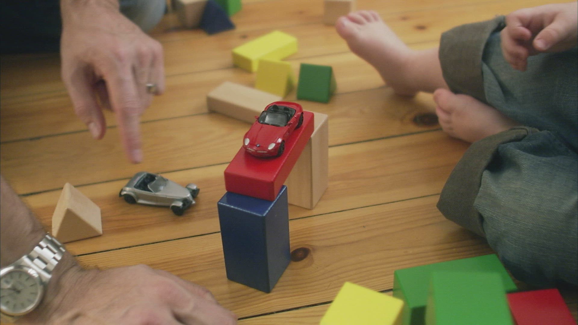 > 1964: father son playing on floor with car on track CALIFORNIA