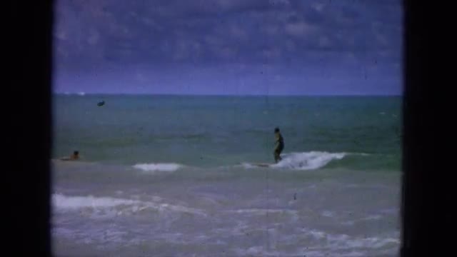 > 1965: two girls watching man surf towards beach past other surfers HAWAII